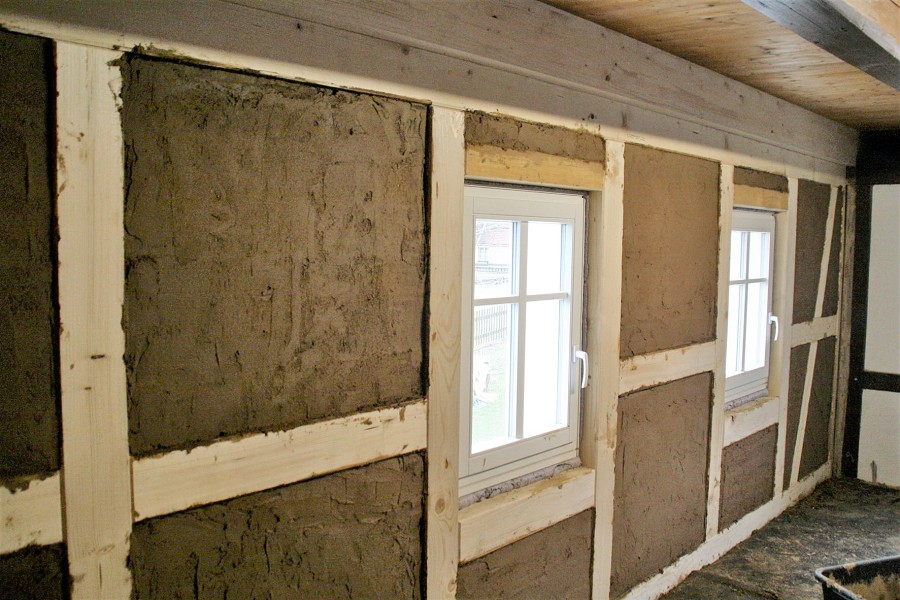 Lehmverstrich der Hölzer und dem Aussetzen der Gefache mit